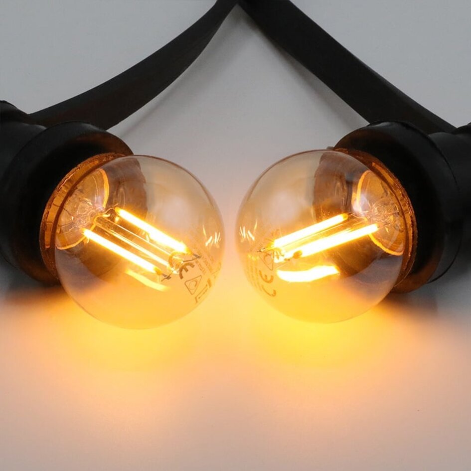 Cet ensemble de guirlande avec lampes à filament est parfait pour éclairer votre salon, votre terrasse ou votre restaurant. Le verre ambré procure un effet lumineux, agréable et chaud, créant une ambiance chaleureuse. Avec une puissance de 2,5 watts, les ampoules sont idéales pour éclairer une grande pièce ou une vaste terrasse.
