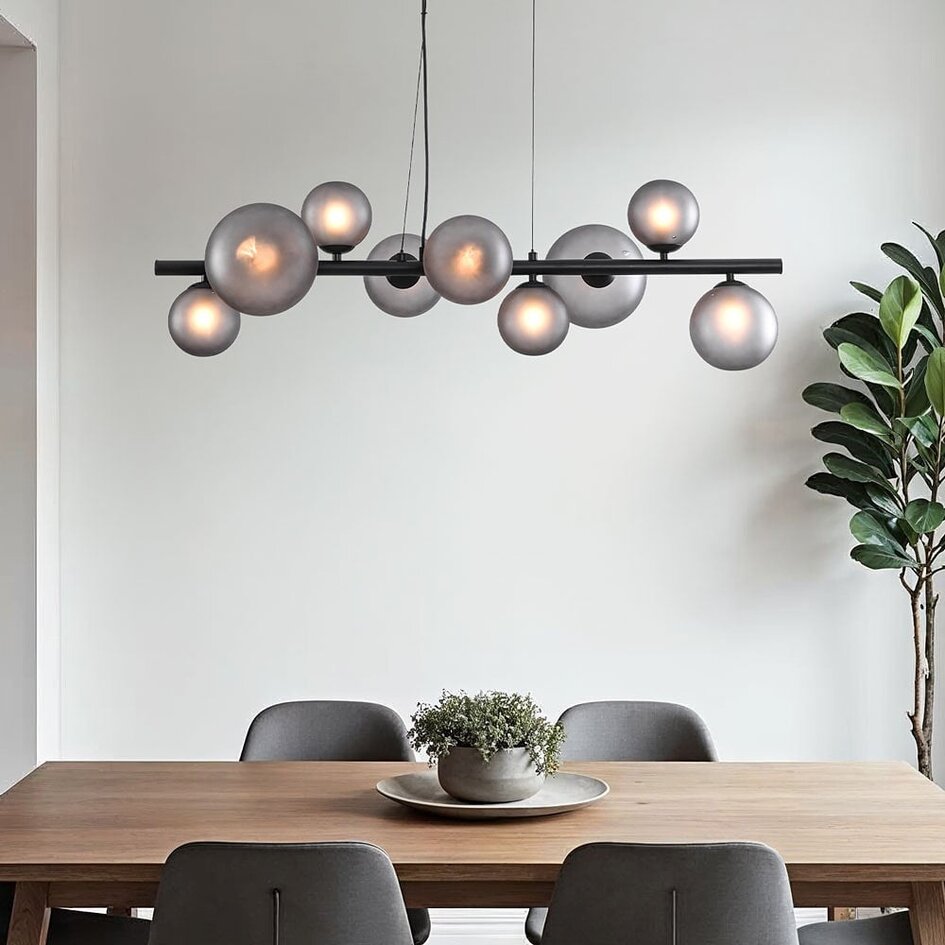 Vous recherchez une suspension qui attire immédiatement le regard ? Givree est faite pour vous. Avec son design raffiné et ses neuf boules en verre gris mat, elle s’impose comme une pièce maîtresse dans un intérieur moderne. Idéale au-dessus d’un long îlot de cuisine ou d’une table à manger, elle allie équilibre et dynamisme. Les boules de verre, de tailles variées, semblent flotter autour de la structure métallique noire, apportant une touche aérienne et ludique. Le verre mat gris diffuse une lumière douce et homogène, créant une ambiance élégante et chaleureuse.