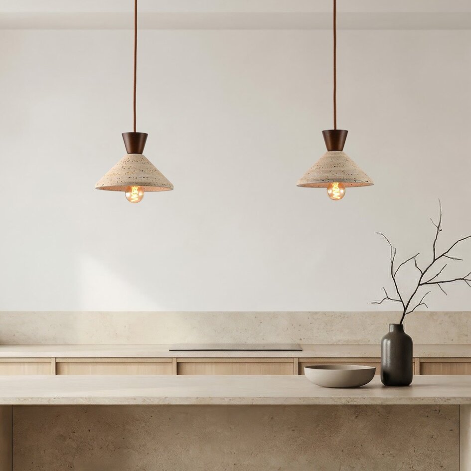 Suspension Japandi à 2 lumières Mara en travertin (pierre naturelle) et bois
